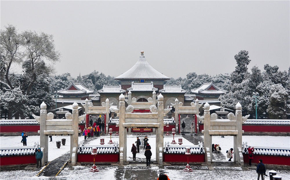 2019年11月30日,北京,初雪過后,天壇公園銀裝素裹,白雪古建相互映襯,景色迷人。天壇公園里觀雪賞景的市民絡(luò)繹不絕。喬健/千龍圖像/視覺中國