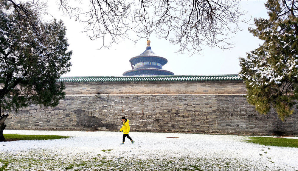 12月16日,在北京天壇公園,一名市民雪中健身。當(dāng)日,北京迎來降雪天氣。新華社記者鞠煥宗攝