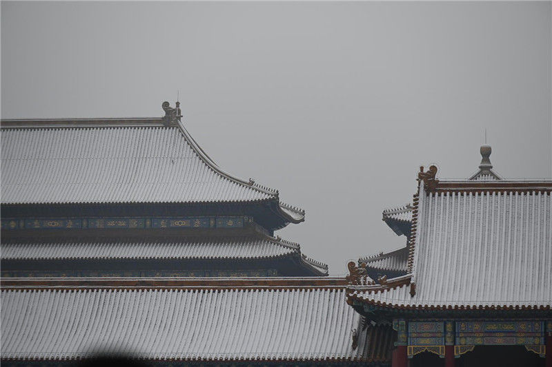 12月16日,在北京故宮,兩只喜鵲停在太和殿上。當(dāng)日,北京迎來降雪天氣。新華社記者金良快攝