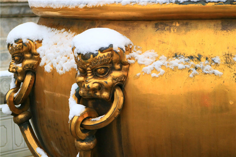 這是故宮斷虹橋上的獅子(12月16日攝)。12月16日,北京迎來降雪天氣。新華社記者金良快攝