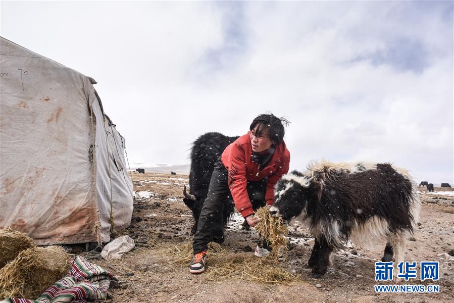 2月22日,才巴拉加在麥雄灘的帳篷前給牛犢喂飼料。今年年初,青海省玉樹(shù)藏族自治州遭遇重度雪災(zāi),部分地區(qū)積雪深度超過(guò)半米,牲畜覓食困難,餓死凍死超2萬(wàn)頭只。麥雄灘位于巴顏喀拉山腳下的玉樹(shù)藏族自治州稱(chēng)多縣清水河鎮(zhèn)文措村,是此次玉樹(shù)雪災(zāi)中化雪較快、接納受災(zāi)轉(zhuǎn)場(chǎng)外地牧民最多的地點(diǎn)之一。文措村黨支部書(shū)記白尕召集村民開(kāi)會(huì),大家一致同意拿出30萬(wàn)畝草場(chǎng),供受災(zāi)更嚴(yán)重的其他地區(qū)牧民使用。新華社記者吳剛攝