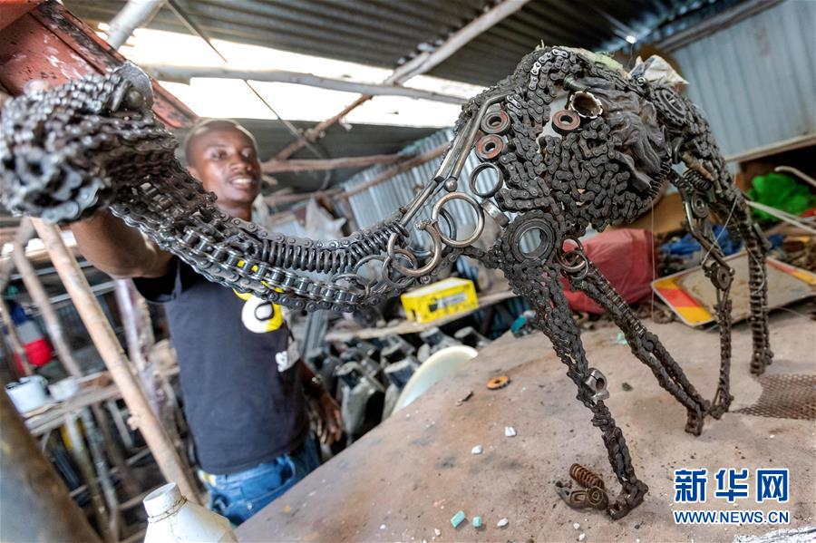 12月20日,在肯尼亞內(nèi)羅畢庫奧納藝術(shù)中心,一名藝術(shù)家展示裝置藝術(shù)作品。成立于1995年的庫奧納藝術(shù)中心位于肯尼亞首都內(nèi)羅畢市區(qū),目前有17間雕塑、繪畫等藝術(shù)工作室。中心不定期舉辦藝術(shù)展覽活動,園區(qū)內(nèi)陳列有各類涂鴉墻及裝置藝術(shù)作品。   新華社記者 王騰 攝