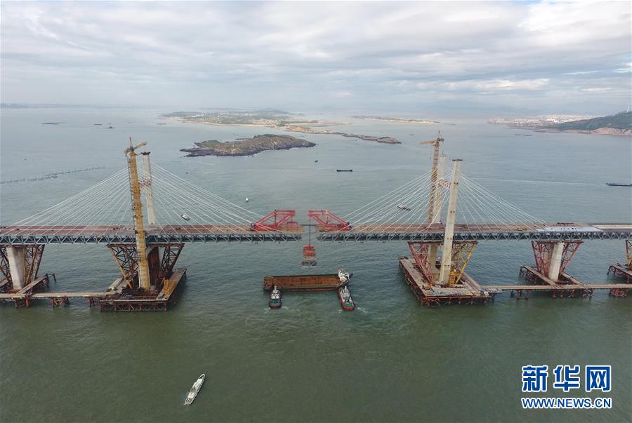 9月21日,平潭海峽公鐵大橋鼓嶼門航道橋鋼桁梁被架梁起重機(jī)穩(wěn)穩(wěn)地提升起來(lái)(無(wú)人機(jī)拍攝)。新華社記者林善傳攝
