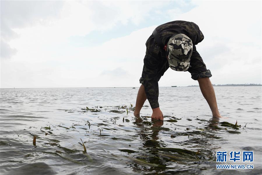 海南清瀾港省級(jí)自然保護(hù)區(qū)護(hù)林員呂詩(shī)陽(yáng)在保護(hù)區(qū)內(nèi)的灘涂上查看海草情況(12月17日攝)。 新華社記者楊冠宇攝