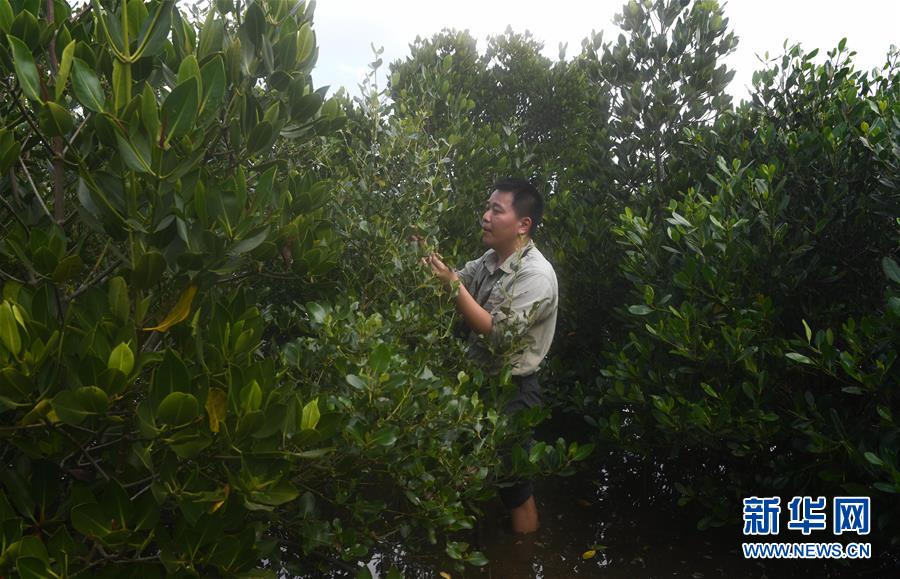 海南新盈紅樹(shù)林國(guó)家濕地公園巡護(hù)員兼監(jiān)測(cè)員羅理想在濕地公園內(nèi)的灘涂上做監(jiān)測(cè)(11月27日攝)。 羅理想2006年起開(kāi)始參與紅樹(shù)林濕地的保護(hù)工作,近年來(lái)他參加了很多關(guān)于濕地的培訓(xùn)。2016年,羅理想在工作中監(jiān)測(cè)到極危鳥(niǎo)種勺嘴鷸,當(dāng)時(shí)有許多媒體做了報(bào)道,后來(lái)他又配合專家在濕地公園里發(fā)現(xiàn)了拉氏紅樹(shù),“那個(gè)時(shí)候感覺(jué)自己的工作很有價(jià)值”,羅理想說(shuō)。 新華社發(fā)