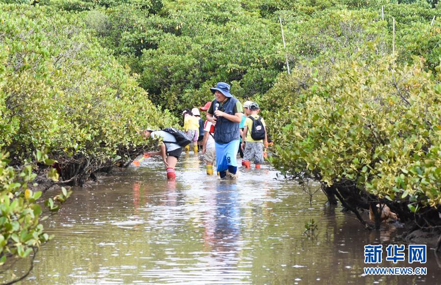 海南東寨港國(guó)家級(jí)自然保護(hù)區(qū)林業(yè)工程師馮爾輝(前)在保護(hù)區(qū)內(nèi)為學(xué)生進(jìn)行講解(7月16日攝)。 馮爾輝2009年大學(xué)畢業(yè)后來(lái)到保護(hù)區(qū)工作,小時(shí)候他家就住在紅樹(shù)林邊上,他從小和紅樹(shù)林打交道,喜歡動(dòng)植物和鳥(niǎo)類。外貿(mào)專業(yè)畢業(yè)的他邊工作邊學(xué)習(xí),目前主要從事鳥(niǎo)類監(jiān)測(cè)、紅樹(shù)林保育、自然教育等工作?!凹t樹(shù)林看著我長(zhǎng)大”,馮爾輝說(shuō),濕地保護(hù)的工作非常有意義。 新華社發(fā)