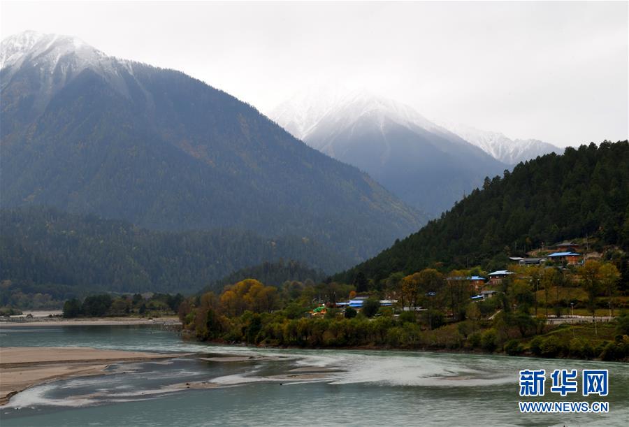 西藏波密縣境內(nèi)古鄉(xiāng)湖畔的雪山、彩林和民居(10月25日攝)。新華社記者陳天湖攝