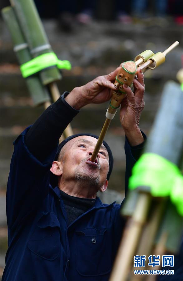 在烏英苗寨新蘆笙柱下,融水苗族自治縣苗族蘆笙音樂代表性傳承人梁安合(右)在練習(xí)吹蘆笙(12月24日攝)。新華社記者王諾攝