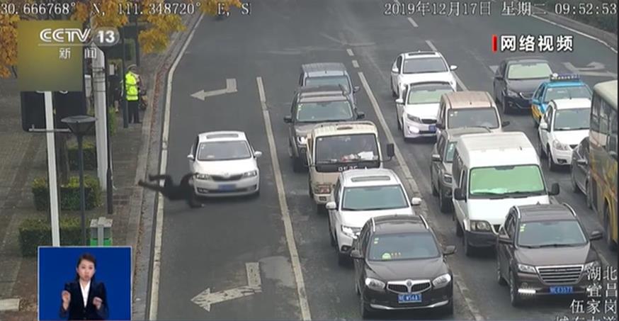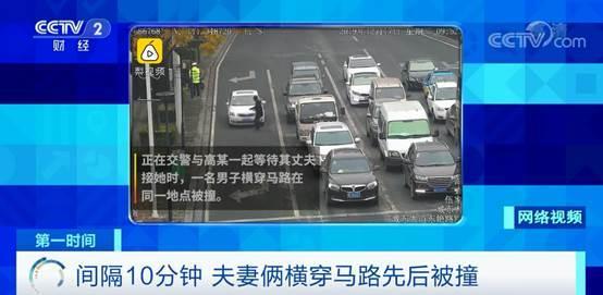 大概10分鐘左右,一名男子小跑著橫穿機(jī)動車道,在高某被撞的同一地點(diǎn),也被一輛白色小車給撞倒。而這名男子正是高某的丈夫。