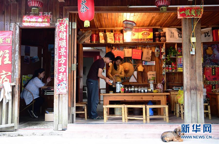在龍巖市永定區(qū)湖坑鎮(zhèn)洪坑村土樓群游覽區(qū),土樓周邊的村民開設(shè)了農(nóng)產(chǎn)品特產(chǎn)店和飲食店來吸引游客消費(5月4日攝)。新華社記者魏培全攝