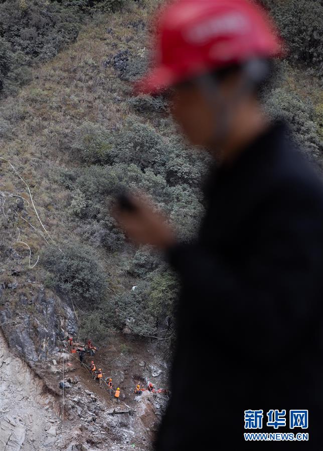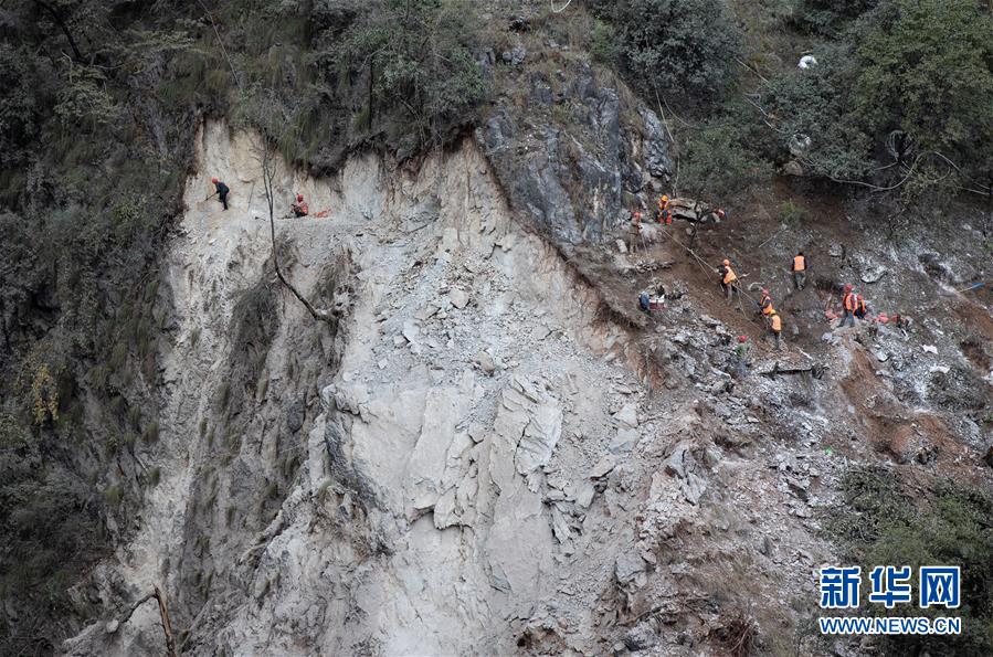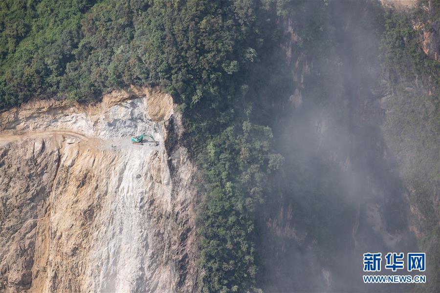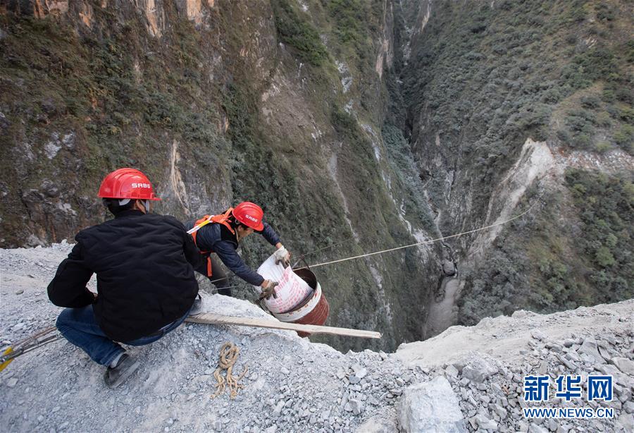 阿布洛哈村通村公路施工遇到陡崖夾溝地勢(shì),項(xiàng)目進(jìn)程艱難緩慢,四川路橋施工隊(duì)伍開(kāi)始在峽谷兩邊分頭推進(jìn)(2019年11月20日攝)。新華社記者江宏景攝