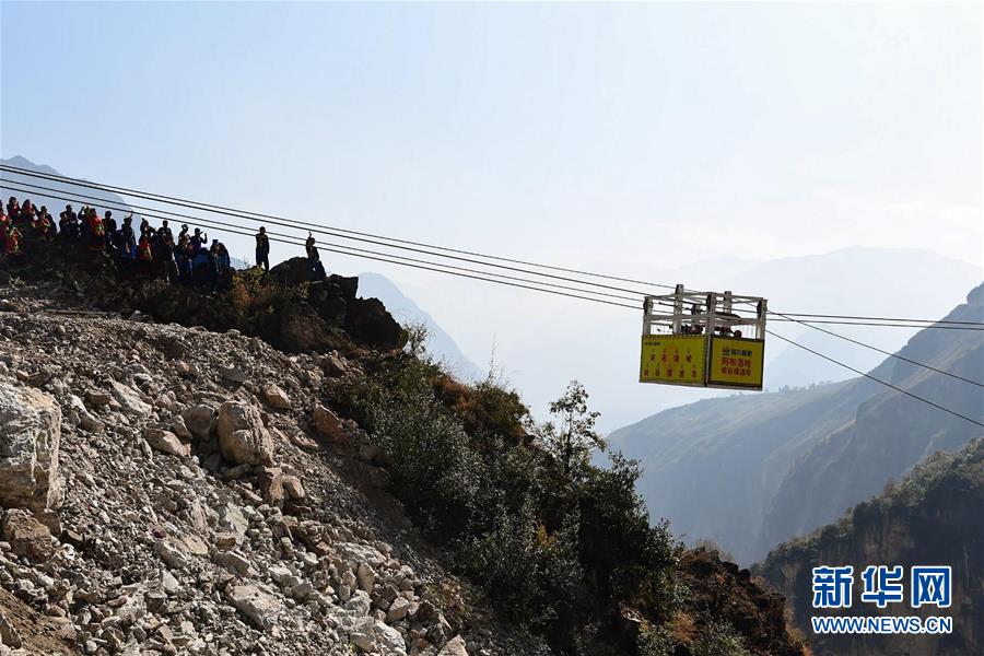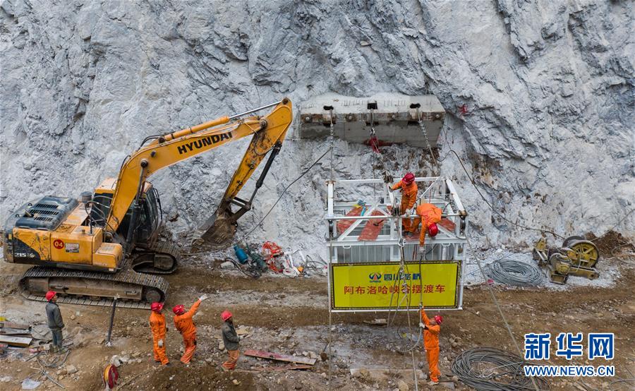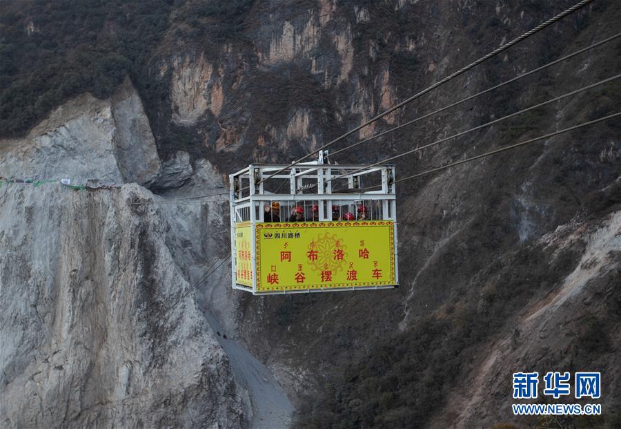 阿布洛哈擺渡車(chē)載著四川路橋的工人在峽谷兩岸運(yùn)行調(diào)試(2019年12月30日攝)。新華社記者江宏景攝