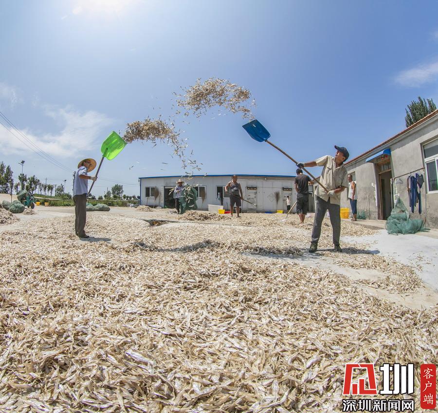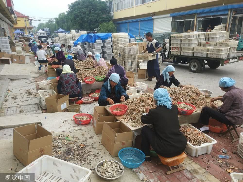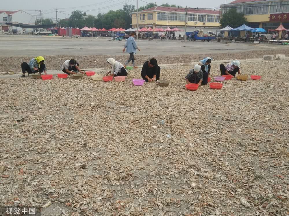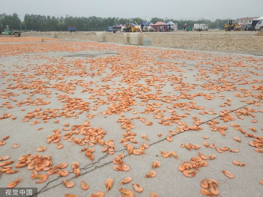 渤海灣畔海產(chǎn)豐收,成群魚蝦分揀后當(dāng)街晾曬,場(chǎng)面賽曬糧食