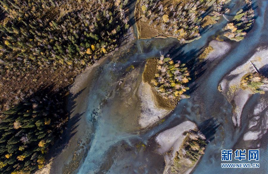9月24日無人機拍攝的喀納斯景區(qū)風光。新華社記者王菲攝
