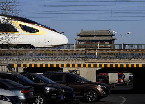 2019年1月25日,一列“復興號”動車組列車在北京永定門城樓附近的京津城際鐵路上行駛。新華社記者邢廣利攝