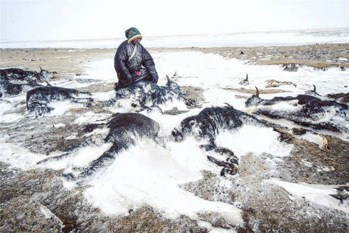 2019年2月23日,青海省玉樹藏族自治州稱多縣扎朵鎮(zhèn)治多村牧民坐在自家被凍死的牦牛前。2018年12月下旬以來,玉樹州境內多次大范圍降雪,部分地區(qū)遭受重度、特重度雪災。 新華社記者吳剛攝