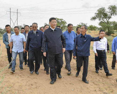 2019年8月19日至22日,中共中央總書記、國家主席、中央軍委主席習近平在甘肅考察。這是21日上午,習近平在武威市古浪縣八步沙林場察看林場整體風貌,聽取武威市防沙治沙整體情況匯報和八步沙林場“六老漢”三代人治沙造林的感人事跡。新華社記者謝環(huán)馳攝