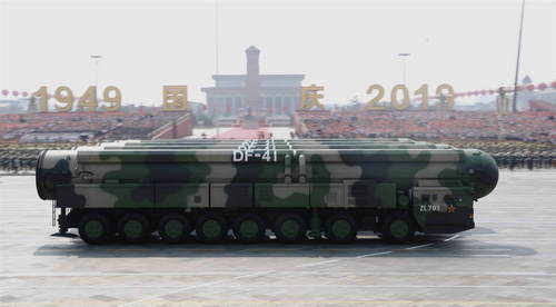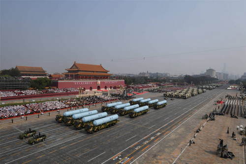 2019年10月1日,慶祝中華人民共和國成立70周年大會在北京天安門廣場隆重舉行。這是東風-41核導彈方隊接受檢閱。新華社記者劉彬攝