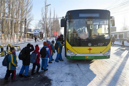 2019年12月18日,在新疆伊犁哈薩克自治州察布查爾錫伯自治縣海努克鄉(xiāng)阿熱吾斯塘村小學,學生排隊登上“校車專線”。新華社記者丁磊攝