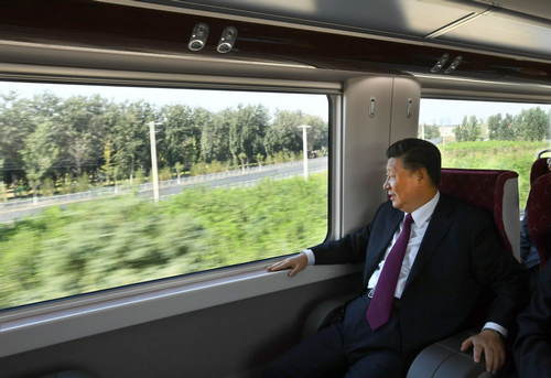 2019年9月25日上午,北京大興國際機場投運儀式在北京舉行。中共中央總書記、國家主席、中央軍委主席習近平出席儀式,宣布機場正式投運并巡覽航站樓。這是習近平乘坐軌道列車前往北京大興國際機場。新華社記者謝環(huán)馳攝