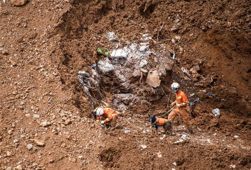 2019年7月26日,救援人員在貴州省水城縣“7·23”特大山體滑坡災害現場進行搜救。新華社記者陶亮攝