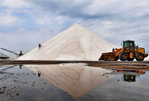 2019年7月3日,河北唐山海港經濟開發(fā)區(qū)大清河鹽場的工人在洗鹽場工作。新華社記者楊世堯攝