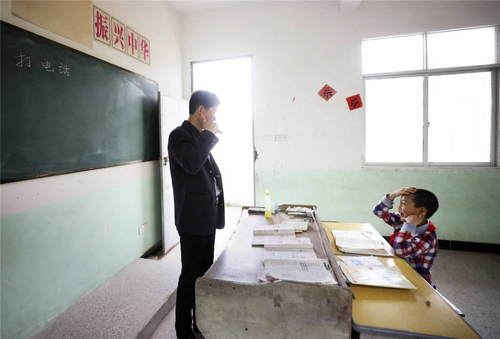 2019年5月8日,王北海(左)在教室內為陳威宇講解“打電話”的流程。江西省瑞金市大柏地鄉(xiāng)三河小學坐落于大山深處,老師王北海陪伴著他唯一的學生陳威宇。新華社記者蘭紅光攝