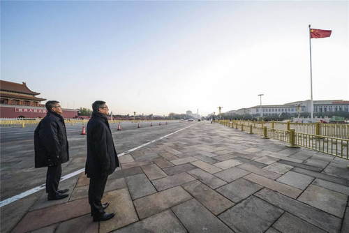 2019年12月7日,新任香港特區(qū)政府警務處處長鄧炳強(右)率香港警務處代表團來到北京天安門廣場,觀看升國旗儀式。新華社記者殷剛攝