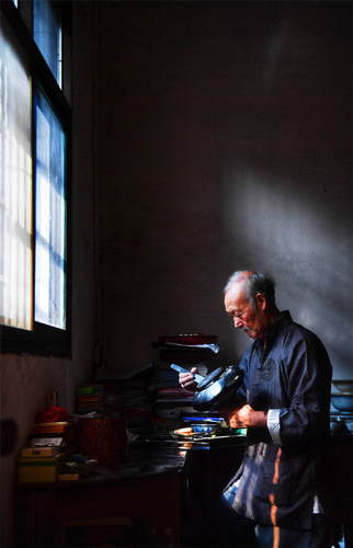 2019年10月12日,在江西省鄱陽縣鄱陽鎮(zhèn),76歲的“鄱陽脫胎漆器髹飾技藝”國家級非物質文化遺產代表性傳承人丁國坤在家中為一件未成形的脫胎漆器“上漆”。新華社記者胡晨歡攝