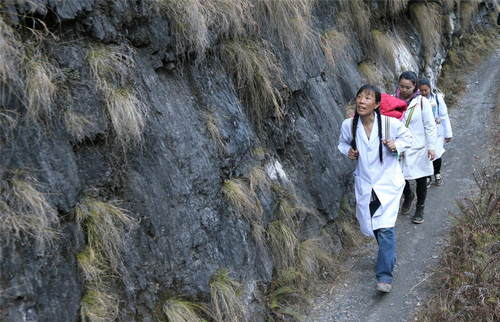 2019年1月13日,在云南省貢山縣丙中洛鎮(zhèn),管延萍(左)與同事走在進村的山路上。管延萍從經濟發(fā)達的珠三角地區(qū),自愿到深度貧困地區(qū)云南怒江傈僳族自治州參加東西部扶貧協(xié)作,并主動申請將期限從半年延長至3年。 新華社記者張加揚攝