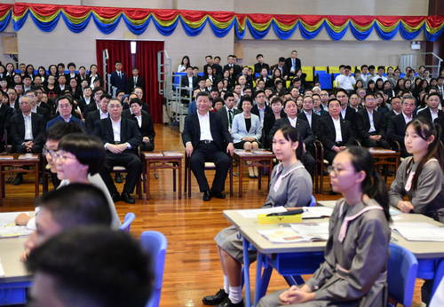 2019年12月19日,國家主席習近平在澳門特別行政區(qū)行政長官崔世安陪同下,來到位于澳門黑沙環(huán)的政府綜合服務中心和濠江中學附屬英才學校,同澳門市民和師生親切交流。這是習近平在濠江中學附屬英才學校觀摩以“‘一國兩制’與澳門”為題的中國歷史公開課。新華社記者李濤攝