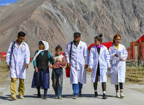 2019年7月7日,新疆塔什庫爾干塔吉克自治縣達布達爾鄉(xiāng)熱斯喀木村村醫(yī)發(fā)爾亞特·塔西白克(右三)與來自鄉(xiāng)衛(wèi)生院的醫(yī)務人員來到熱斯喀木村易地扶貧搬遷安置點出診。從過去騎著馬深入大山牧場巡診,到現在定期前往集中居住點上門服務;從過去幾種簡單的常備藥,到如今種類豐富的各類藥品……新疆牧區(qū)的醫(yī)療條件和水平大幅提升,牧民享受到越來越多、越來越便利的醫(yī)療惠民服務。新華社記者胡虎虎攝