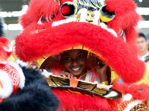 2019年10月28日,來自印度洋島國科摩羅的拉一莎在河南省鄭州西亞斯學院體驗舞獅。新華社記者李嘉南攝