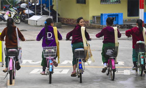 2019年3月8日,在云南省瑞麗市姐相鄉(xiāng)銀井村,銀井小學幾名緬籍學生騎車回家,跨過銀井邊防口岸國境線。每天清晨,都有一群孩子通過銀井邊防站,從緬甸來到瑞麗市銀井小學讀書。新華社記者李曉果攝