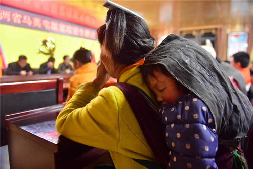 2019年3月14日,一名婦女背著小孩參加烏英苗寨脫貧產業(yè)會議。烏英苗寨位于桂黔交界的大苗山深處,共有140戶600多人,其中100戶屬廣西柳州市融水苗族自治縣桿洞鄉(xiāng)黨鳩村,40戶屬貴州省從江縣翠里瑤族壯族鄉(xiāng)南岑村。這里交通不便,土地資源匱乏,自然環(huán)境惡劣,曾經是一個極度貧困的苗寨。2019年,全寨共有44戶貧困戶實現脫貧,貧困戶已從2016年的92戶減少到目前的4戶。新華社記者黃孝邦攝