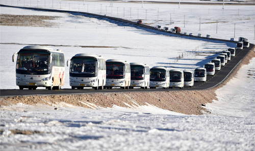 2019年12月23日拍攝的西藏那曲市雙湖縣牧民的遷徙車隊。西藏那曲市雙湖縣嘎措鄉(xiāng)、措折羌瑪鄉(xiāng)、雅曲鄉(xiāng)共2900人,告別了平均海拔5000米的家鄉(xiāng),經過近千公里搬遷到海拔相對較低的藏南雅魯藏布江南岸的貢嘎縣境內。這是西藏自治區(qū)近年來實施的極高海拔生態(tài)搬遷項目之一,雙湖縣三個鄉(xiāng)的整體搬遷是其中人數最多、跨度最遠的一次搬遷。新華社記者覺果攝