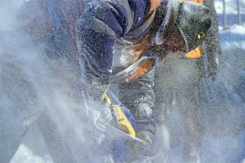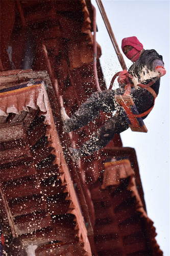 2019年1月23日,在黑龍江省漠河市嫩林線674公里處,加格達奇工務段橋隧工杜志彪在進行涵洞除冰作業(yè)。新華社記者才揚攝