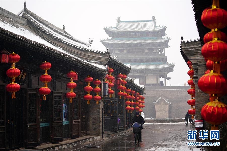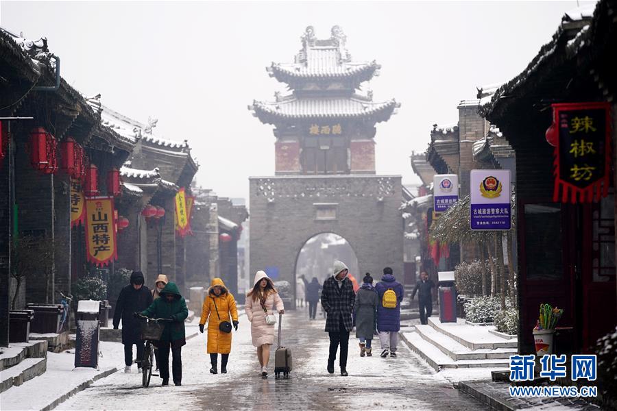 當(dāng)日,山西省平遙縣迎來降雪,雪中的平遙古城銀裝素裹,美景如畫。平遙古城是目前中國保存最完整的古代縣級城池之一,1997年被列入世界文化遺產(chǎn)名錄。