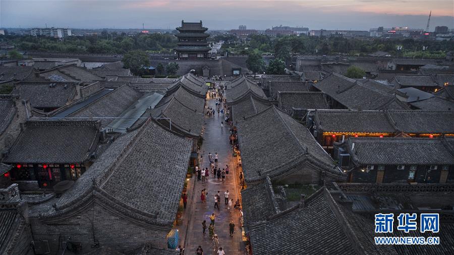 這是7月19日無人機(jī)拍攝的夕陽下的平遙古城。