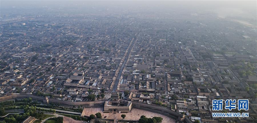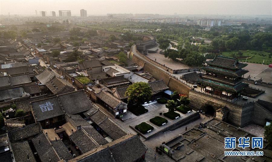 這是7月20日無人機(jī)拍攝的晨曦中的平遙古城。