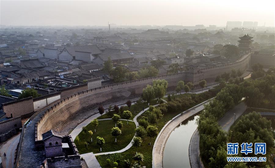 這是7月20日無人機(jī)拍攝的平遙古城墻與護(hù)城河。平遙古城城墻總周長6163米,墻高約12米,把面積約2.25平方公里的平遙縣城隔為兩個(gè)風(fēng)格迥異的世界。城墻以內(nèi)街道、鋪面、市樓保留明清形制,城墻以外為新城。