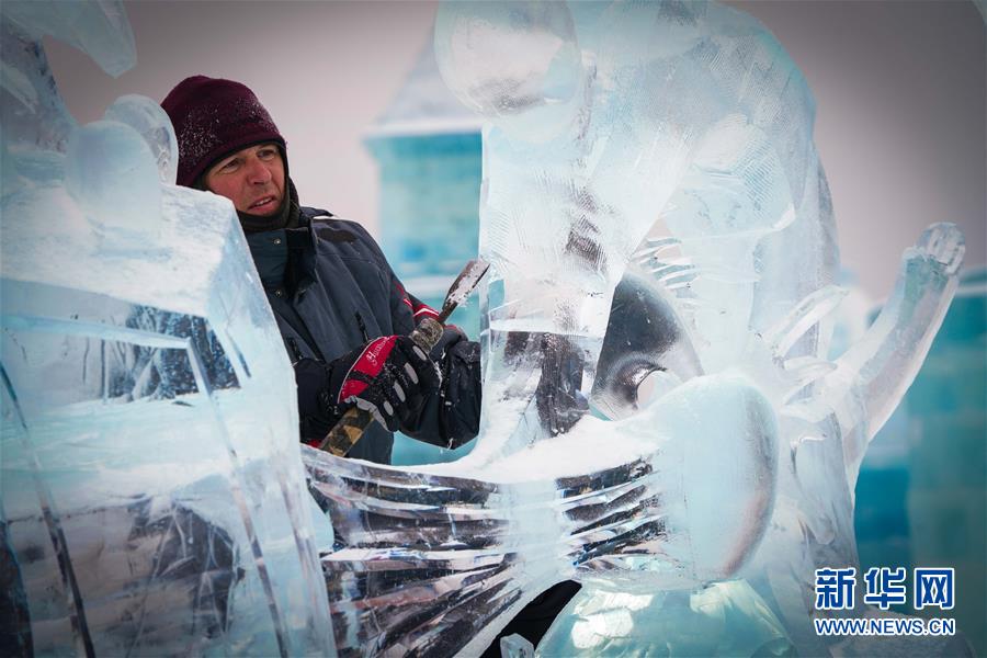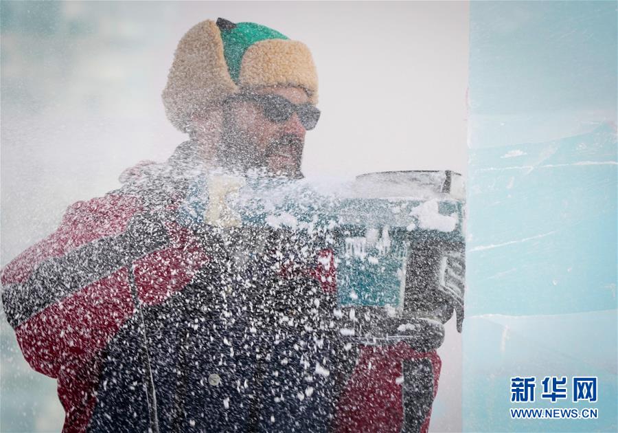 第九屆中國(guó)·哈爾濱國(guó)際組合冰雕比賽選手在哈爾濱冰雪大世界內(nèi)制作冰雕(1月2日攝)。新華社記者王松攝