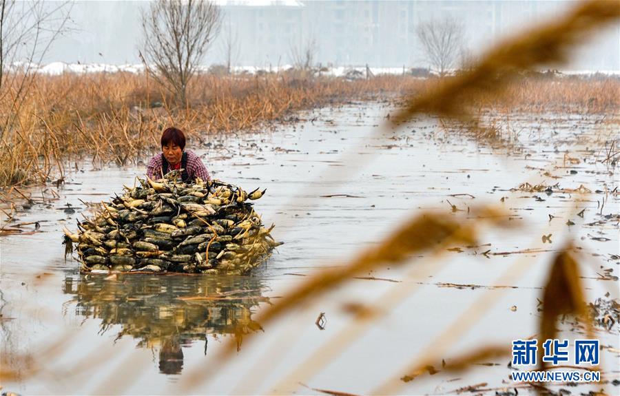 1月10日,村民在磁縣禾下土白蓮藕立體種養(yǎng)基地收獲蓮藕。 新華社記者 王曉 攝