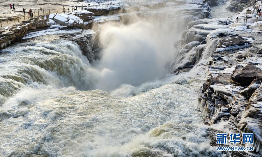 12月14日,游人在壺口瀑布景區(qū)游玩(無人機拍攝)。位于秦晉大峽谷的黃河壺口瀑布,冬日水量較夏日雖然有所減少,但驚天動地的濤聲依舊,周圍石壁上的冰掛與河中的浪濤構(gòu)成一幅獨特的北國風光圖,吸引游客前來觀賞。新華社記者陶明攝