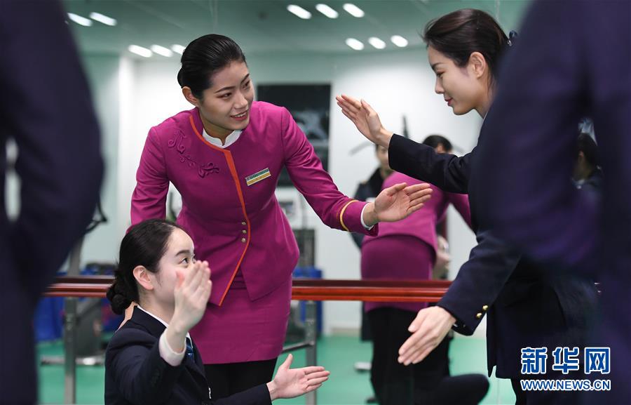 吉如(后左一)在車(chē)站職工活動(dòng)室指導(dǎo)同事禮儀訓(xùn)練(1月15日攝)。新華社記者陶明攝