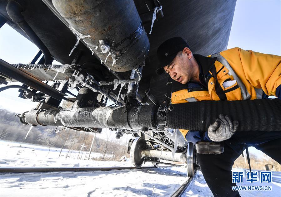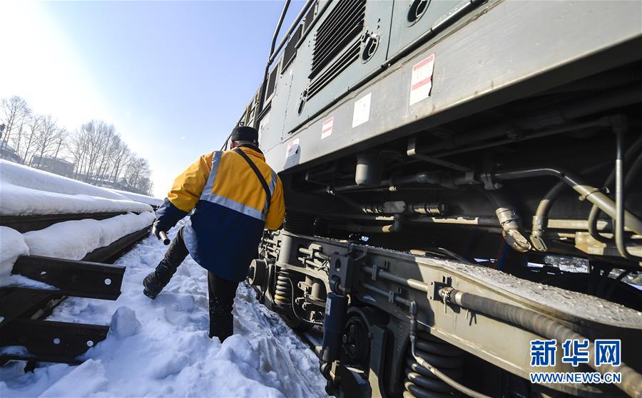 林海間的“送水小火車”調(diào)車員對(duì)“送水小火車”進(jìn)行出行前的檢查作業(yè)(1月17日攝)。新華社記者許暢攝
