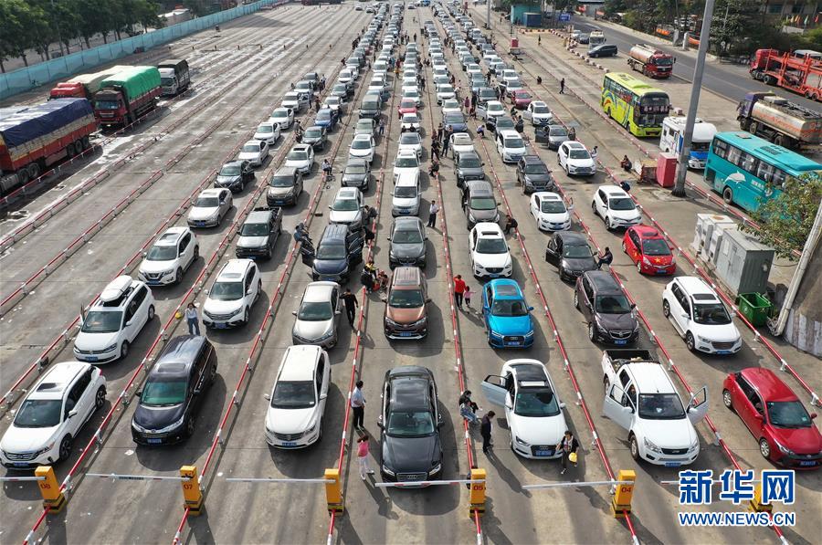 1月19日,車輛在??谛阌⒏圯喍纱a頭等待登船(無人機照片)。 當日是春運第10天,瓊州海峽進入春運進出港高峰。據海南港航控股有限公司數據,截至18日,??谑袃筛劭诖哼\累計進出港旅客54.89萬人次,進出港車輛13.32萬輛次。18日單日進出港旅客9.75萬人次,同比增長43.9%,進出港車輛2.3萬輛車次,同比增長45.5%。 新華社記者 郭程 攝