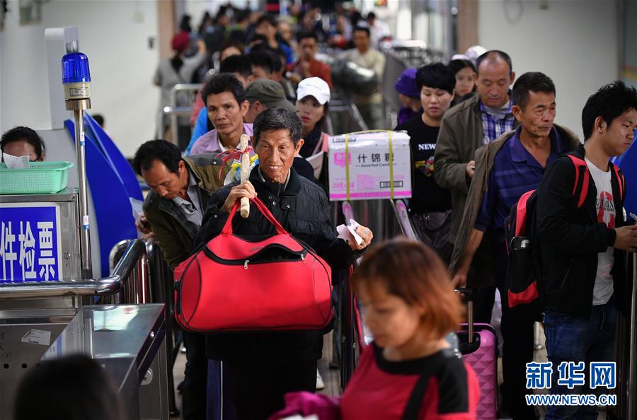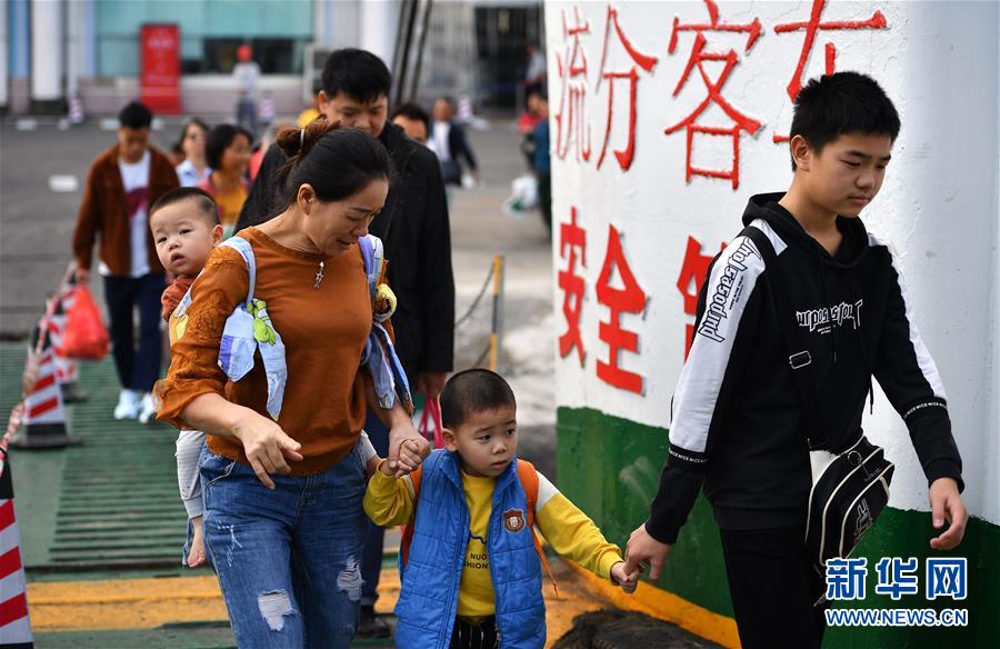 1月19日,來(lái)自湖南的務(wù)工人員在??谛阌⒏圯喍纱a頭登船返鄉(xiāng)。 新華社記者 郭程 攝