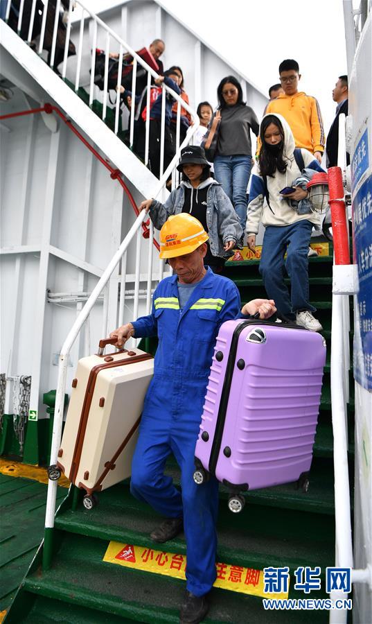 1月19日,客滾輪工作人員幫助乘客搬運(yùn)行李。 新華社記者 郭程 攝