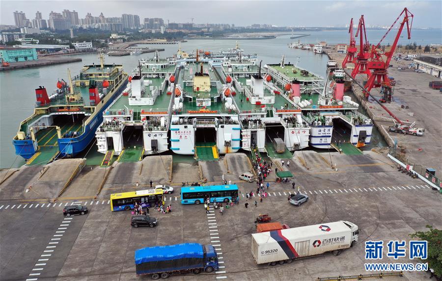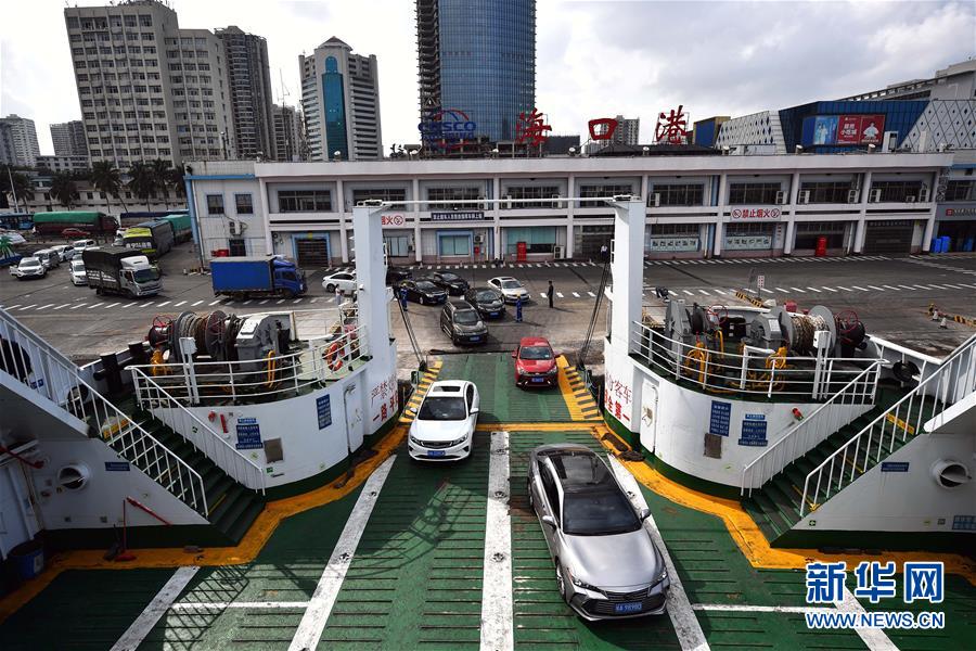 1月19日,車輛在??谛阌⒏圯喍纱a頭登船。 新華社記者 郭程 攝